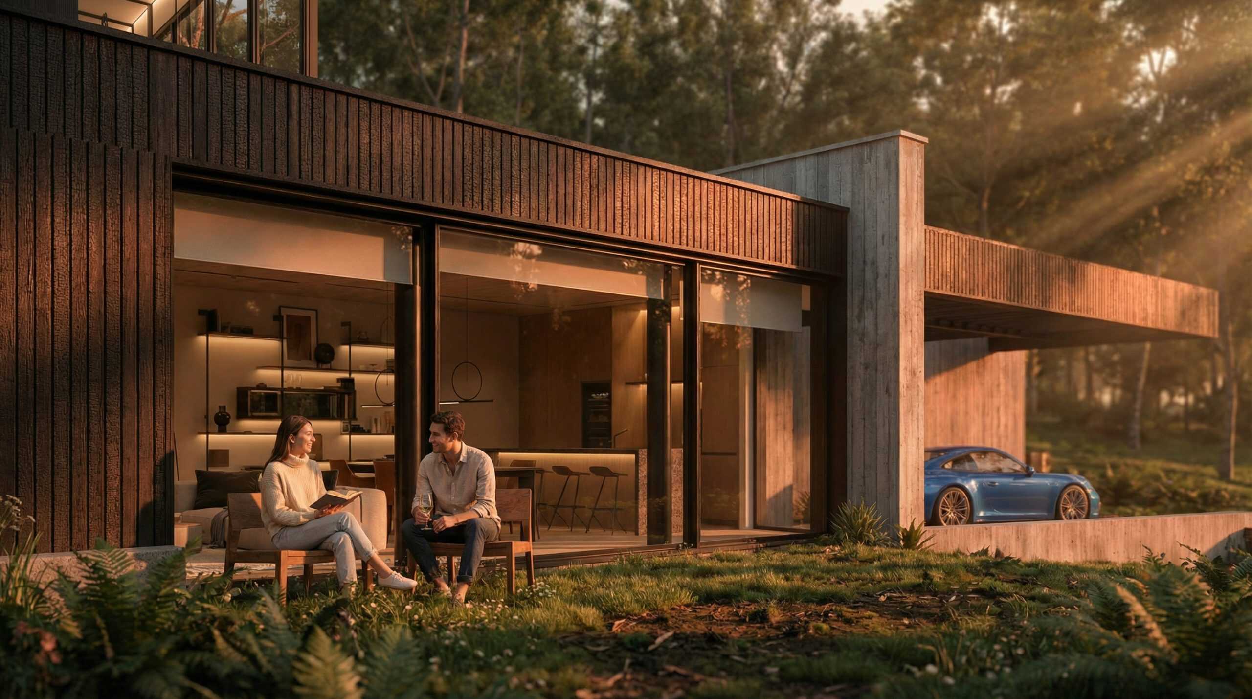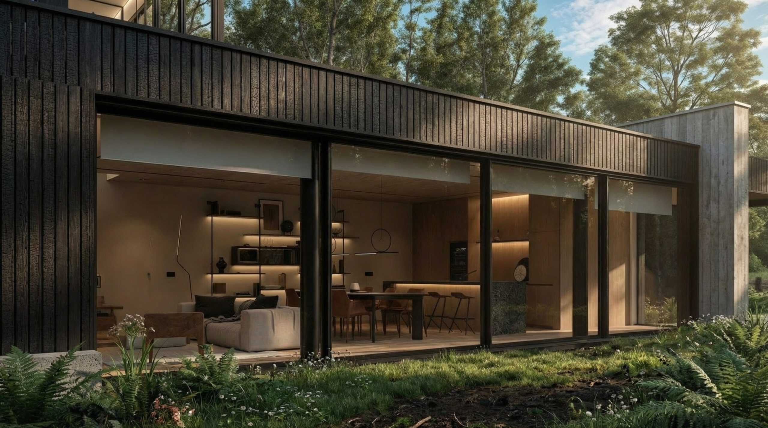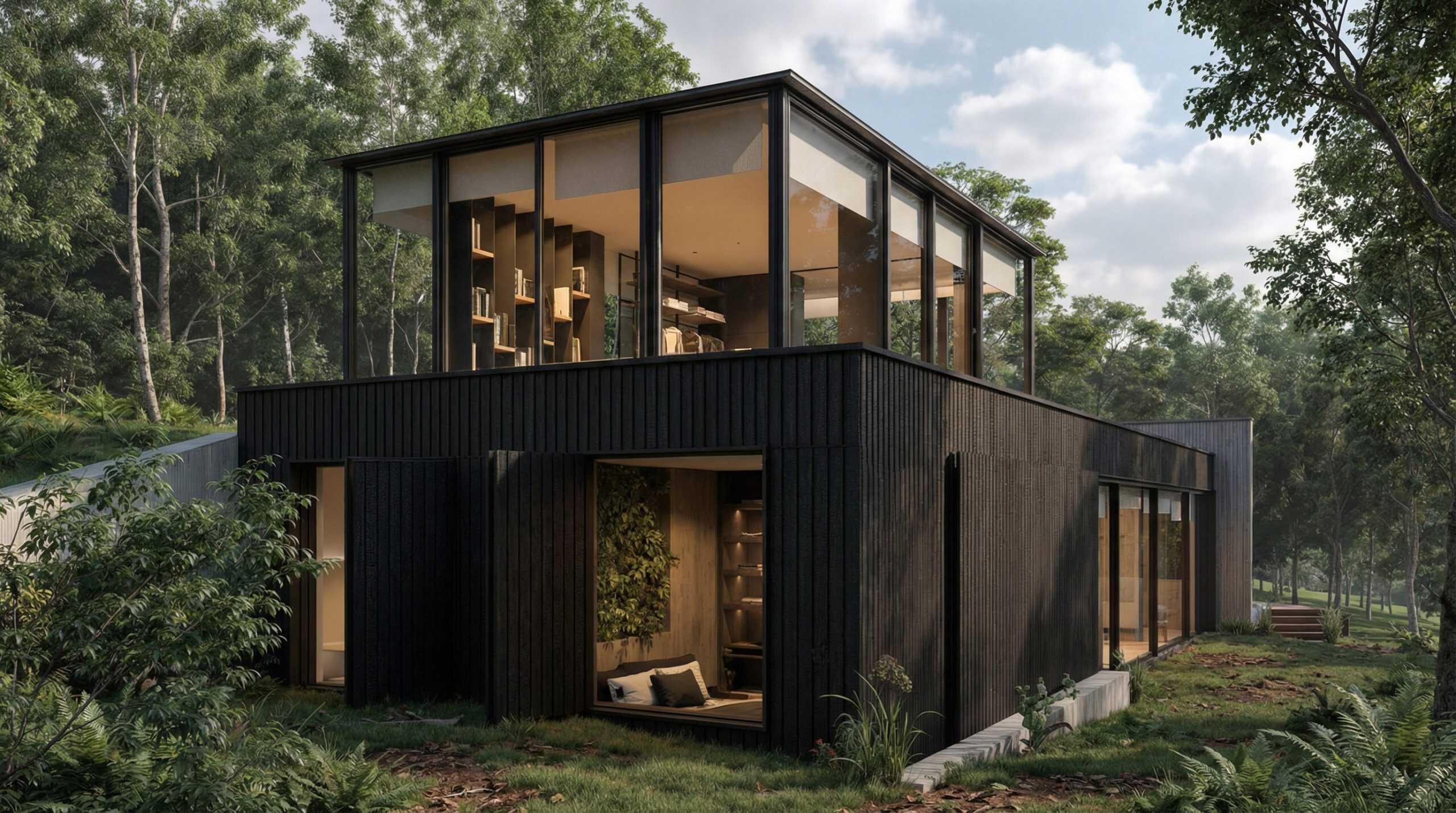 Što se tiče staklenih površina, projektom su predviđene klizne drvene škure koje se mogu potpuno zatvoriti zbog sigurnosti i zaštite od vremenskih neprilika. Takođe, škure pružaju fizičku barijeru i štite staklo. Štaviše, nude potpunu blokadu od sunca. U cilju održanja vizuelne veze sa spoljnim prostorom i integracije objekta, projektovan je zeleni krov. U funkcionalnom smislu, dvospratni objekat raspolaže glavnom spavaćom sobom na gornjem spratu, pri čemu je soba u potpunosti zastakljena sa svih strana u cilju pružanja iskustva boravka u zatvorenom i na otvorenom u isto vrijeme.